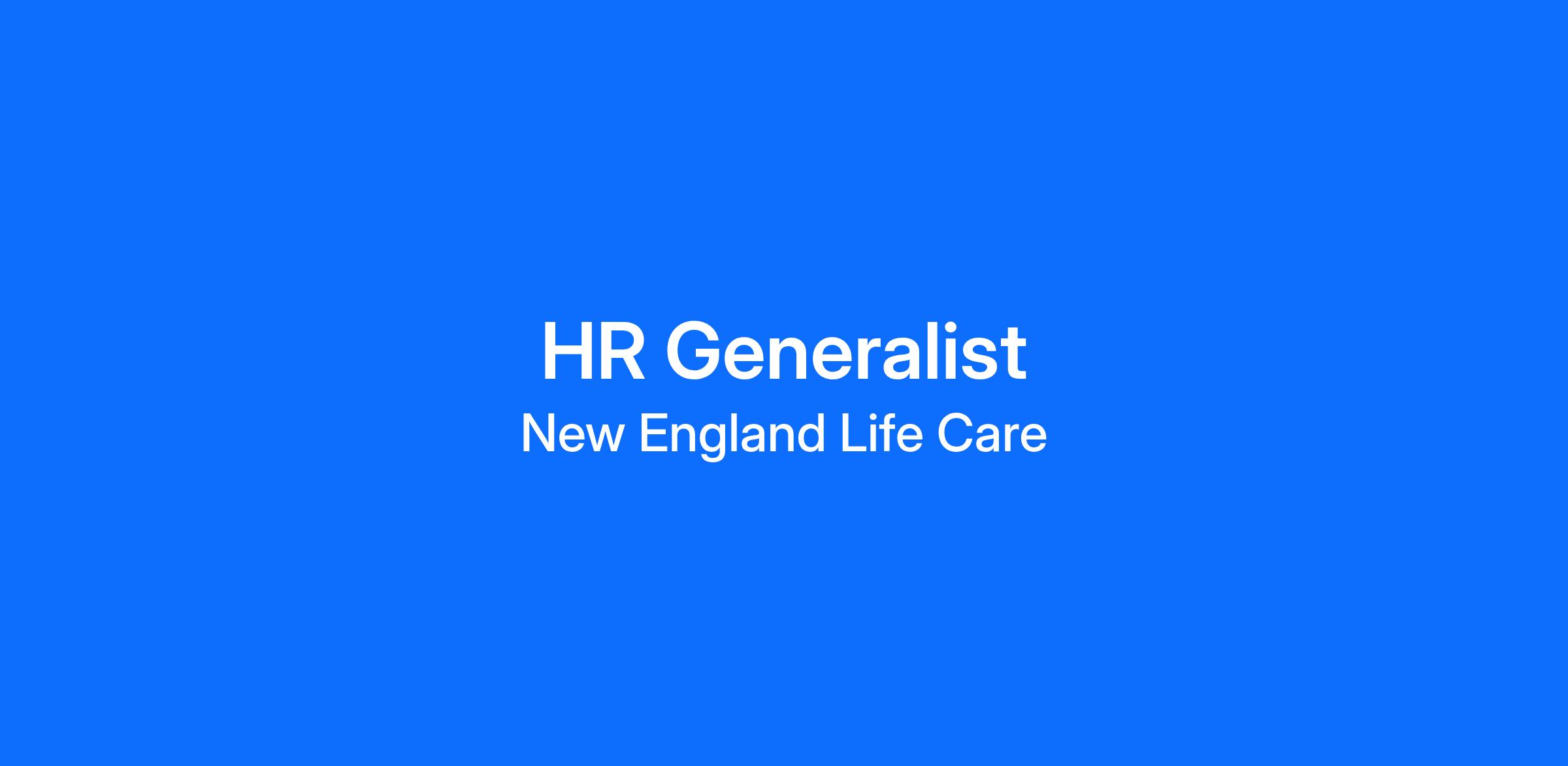 New England Life Care is hiring an HR Generalist to join our growing team! This are full–time, salaried, exempt position with a normal Monday – Friday schedule between the hours of 8:30am until 5:00pm.